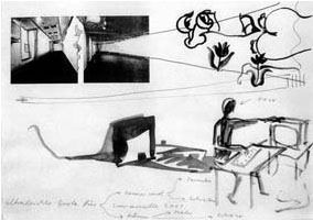 Caramelle präsentiert uns einen ganz anders gearteten Künstler-Koch. Entlassen aus dem Gehäuse, gibt es kein Drängen, weder metaphysischer Wahrheit noch des Triebes, auch keine exzessive Körperlichkeit, sondern Mix-Kultur der „ultraleichten Gesten“, die auch die Materialität eines Raumes hinter sich gelassen haben. Statt mit pflügender Handschrift Spuren auf Papier zu hinterlassen, bewegt sich die Hand des Künstler-Kochs auf der Tastatur des Computers, eine Bewegung, die sich nicht mehr unmittelbar in einem Bild niederschlägt und das im „Schreiner“ ohnehin nur ironisch aufgerufene Handwerk der Kunst fahren läßt. Der screen der black box Computer ist weiß, nurmehr leerer Rahmen. Der flüchtige, skizzenhafte Modus, in dem der Künstler-Koch dargestellt ist, läßt die Darstellung selbst als Effekt einer ultraleichten Geste hervortreten. Dieser Erscheinung widerspricht die genaue, wohl kalkulierte Anordnung des Blattes; die Mühelosigkeit der Zeichnung verdeckt die Anstrengung eines sorgfältigen Arrangements: sprezzatura. Die in der Skizzenhaftigkeit angelegte Offenheit der Bedeutung birgt auch hier ein Versprechen auf Enthüllung, die aber keine höhere Wahrheit im Sinne einer Überschreitung offenbart. Die Fähigkeit zu täuschen, wie sie in der Performanz der sprezzatura ausgestellt wird, betrifft die Person des Künstlers und sein Werk, und sie betrifft die Veröffentlichung beider im Ausstellungsraum, der die Phantasie des Künstlers in Ware verwandelt und zugleich von ihr besetzt wird. Die Dynamik von Sog und Abstoßung, von Einverleibung und Besetzung, die die Darstellung strukturiert, kehrt den Eintritt in den Tausch offensiv hervor.