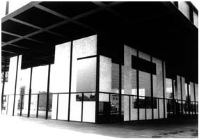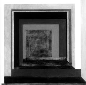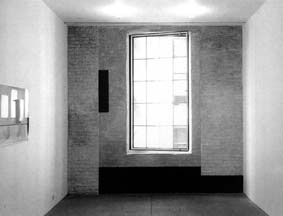 Die Wandmalerei, die Caramelle 1992 in der New Yorker Christine Burgin Gallery angefertigt hat (Abb. 2), erscheint, obwohl sie die gesamte Stirnwand füllt, als Rahmung für das große Fenster. Eine Art verunreinigter Konstruktivismus, stemmt sich die Malerei eigensinnig gegen die Gegebenheit der Wand, zwingt sie in eine Anordnung, die die ursprüngliche Aufteilung zersprengt. Das Fenster rutscht optisch aus der Mitte und kann sich nur durch leichte Öffnung stabilisieren. Von Malerei in ihrer Gewichtung zersetzt, tritt die Wand als solche dennoch erst durch Malerei hervor, in ihrer Materialität, in der Ziegelstruktur, die das Streben der Farbe nach Fläche unterläuft. Im Fenster, im Blick auf die Welt wird deutlich, daß es einen reinen white cube nicht geben kann. In diesem Fall ist die im Ausstellungsraum sichtbare Außenwelt ebenfalls konstruktivistisch zugerichtet, ein Zufall, der die Teilhabe der Außenwelt an der Kunst unterstreicht. Daß das Fenster, die Metapher der Malerei schlechthin, Medium dieser Einlassung der Welt ist, gehört zu den fruchtbaren Paradoxien einer derartigen Institutionskritik. Gegen eine gänzliche Vereinnahmung sträubt sich das Bild im Fenster und behauptet störrisch seinen Status, etwas anderes zu sein. Es ist der Rahmen des Fensters, der diesen Status bestätigt. An der Wand links hängt ein Bild, geometrisch aufgeteilt, vermutlich ein Bild von Caramelle, in verschwommenem Grau grundiert, vielleicht auch überblendet von Spiegelungen des Fensters. Dieser sorgfältig inszenierte installation shot erscheint wieder im Katalog der Nordhorner Ausstellung[3], auf der vorhergehenden bzw. folgenden Seite flankiert von einer Außenansicht von Caramelles „Fenstermalerei“ in der Berliner Neuen Nationalgalerie und einer Malerei ohne Titel, die eine geometrische Ordnung des Bildraums als System von leeren, selbstreflexiven, den Strich des Pinsels hervorhebenden Rahmungen vorführt (Abb. 3 und 4).