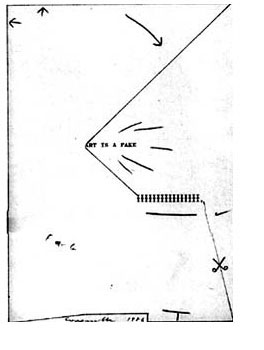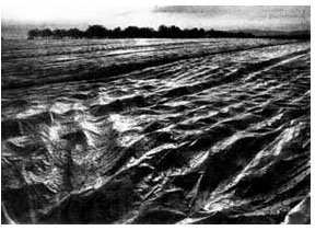 „Art is a fake“, sagt Caramelle mittels einer Inschrift in den Blättern (Abb. 8), um im selben Zug gerade durch Wiederholung den Begriff der Originalität zu erweitern. Forty Found Fakes ist eine Arbeit von 1979, in der die Fälschung das Original „überholt“ hat (Abb. 9).[4] Es handelt sich um eine Buchpublikation, in der Caramelle gefundene Bilder reproduziert und den Abbildungen Namen von Künstlern zuweist, deren Arbeit dem Gefundenen ähnelt. So ist dem Bild einer in einer Landschaft wellig ausgebreiteten Plane der Name „Christo“ beigefügt (Abb. 10). Ein Zimmer mit einer Fächerpalme ruft Broodthaers auf den Plan, Skispuren im Gebirge Richard Long. Caramelle beschreibt die „Überholung“ des Originals durch sein Verfahren wie folgt: