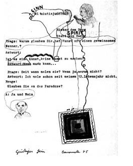Die Bleistifteingriffe auf der Fotografie wiederholen die Interventionen im Ausstellungsraum auf der Fläche, nicht als sensible, räumliche und farbliche Gegebenheiten aufgreifende Gestaltung, die in der Veränderung des Raumes dessen Qualitäten hervortreibt. Die Energie der Setzung betont vielmehr den Eingriff, der als Handschrift auftritt. Die Handschrift verkörpert das Konzept „Originalität“ und leugnet das Prinzip „Wiederholung“. Die Reibung von Originalität und Wiederholung ist konstitutiv für Caramelles Arbeit. Schon früh hat er eigene Zeichnungen wiederholt, manchmal getreu, manchmal mit leichten Varianten. Auch einzelne Bildelemente, Schriftzüge, Wörter oder Sätze tauchen wieder auf, und es gibt Doppelgänger, Figuren des Künstlers, wie Josef Troma oder das Seepferdchen, die wiederholt in Erscheinung treten (Abb. 5). Blätter lautet der unprätentiöse Titel einer Publikation, die Papierarbeiten Caramelles aus den Jahren 1973 bis 1978 versammelt. Die 127 in Originalgröße reproduzierten, nicht chronologisch geordneten Blätter sind Reflexionen über die Bedingung der Möglichkeit von Kunst zwischen Atelier, Markt und Alltag, zwischen fake und betont künstlerischer Setzung. Sparsam colorierte Zeichnung, Hand- und Maschinenschrift sind die Mittel dieser Reflexionen, die meist im selben Zug etwas behaupten und entkräften. „Repeat“ lautet die mit Nachdruck unterstrichene Aufforderung ausgerechnet auf einem der seltenen Blätter, deren expressiver Gestus die geforderte Wiederholung unmöglich macht (Abb. 6). Ein Blatt, das schemenhaft zwei Zwerge, einen Flügel, ein Seepferdchen und eine Palme darstellt, hat Caramelle im selben Jahr als Suchbild mit kleinen Unterschieden wiederholt und zwei Seiten später abgebildet. Das Blatt dazwischen handelt über Sinn und Unsinn und über das Paradoxe als Glaubensfrage: „Geistiges Jein“ (Abb. 7).